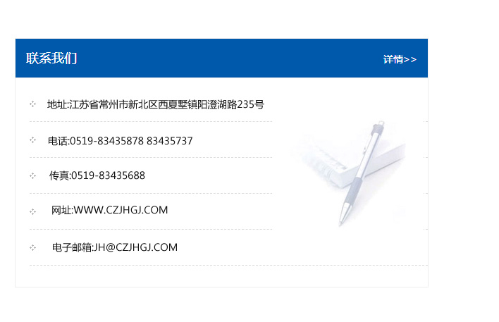 傳真:0519-83435688    郵編:213135    網址:WWW.czjhgj_com.51souwang.com    電子郵箱:JH@czjhgj_com.51souwang.com